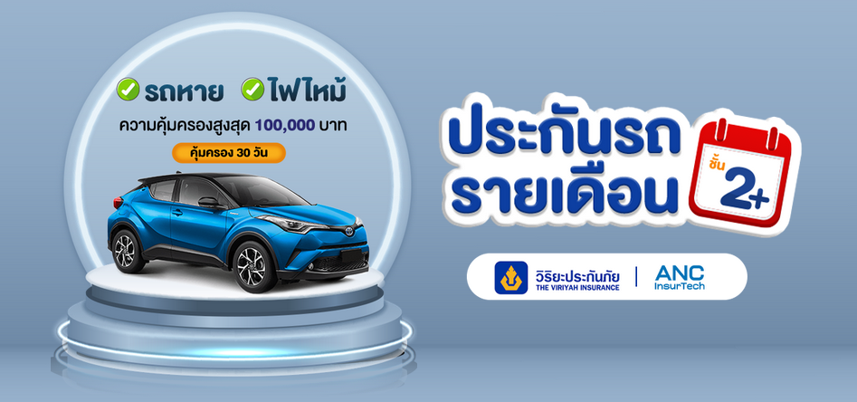 ประกันรถยนต์รายเดือน เเค่ 650 บาท ทุนประกัน 100,000 ชั้น 2+ สูญหาย ไฟไหม้ ซ่อมรถเรา ซ่อมรถคู่กรณี โดย วิริยะ 650.-
