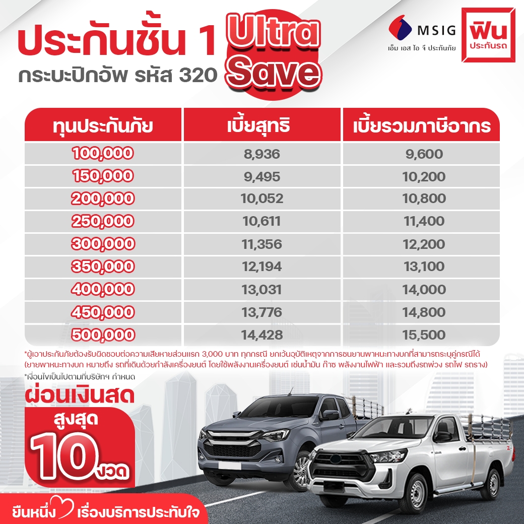 หากคุณกำลังมองหาประกันภัยที่คุ้มครองครบวงจรในราคาสบายกระเป๋า แผน Ultra Save320 เป็นคำตอบที่เหมาะสมที่สุด ด้วยเบี้ยเริ่มต้นเพียง 9,600 บาท และผ่อนได้สูงสุดถึง 10 งวด